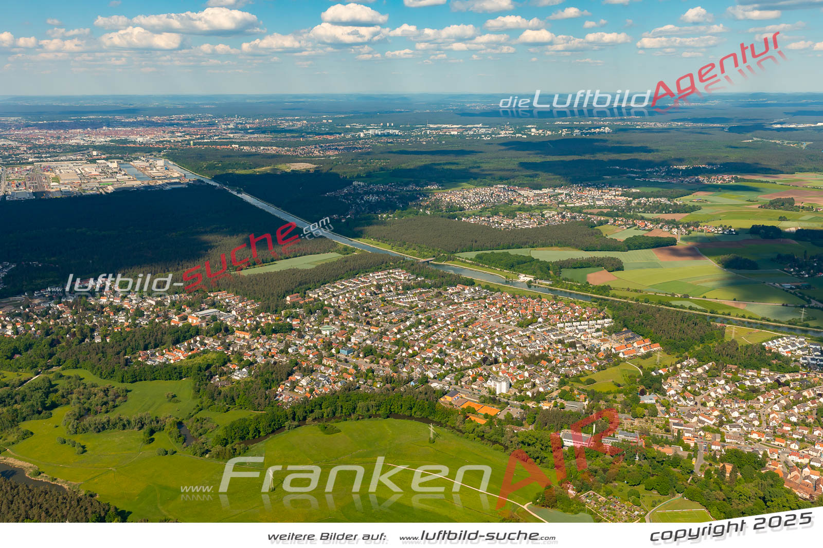 Ein wunderschönes Luftbild des Stadtteils Katzwang bei Nürnberg zeigt die Harmonie zwischen Natur und Stadtleben. Der Main Donau Kanal zieht seine Bahn am Ort vorbei in Richtung Nürnberger Hafen. Die klaren Strukturen der Straßen und Wege zeichnen ein Bild von geordneter Urbanität, das dennoch Platz für Natur lässt. Diese einzigartige Balance macht Katzwang zu einem faszinierenden Ort, der sowohl Ruhe als auch Lebendigkeit ausstrahlt.