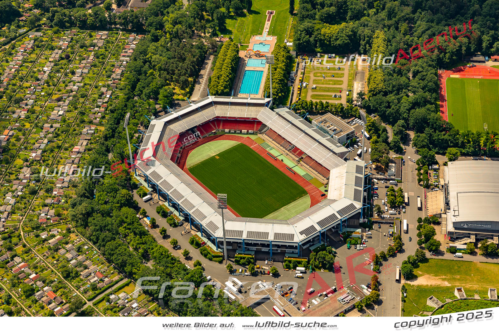 Das Luftbild zeigt das schöne Max Morlock Stadion in seiner vollen Pracht, umgeben von vielen Schrebergärten. Die klare Struktur des Stadions verbindet sich wunderbar mit dem lebendigen Grün der Umgebung. Von oben betrachtet kann man kaum glauben das das Stadion durch einen Neubau ersetzt werden soll.